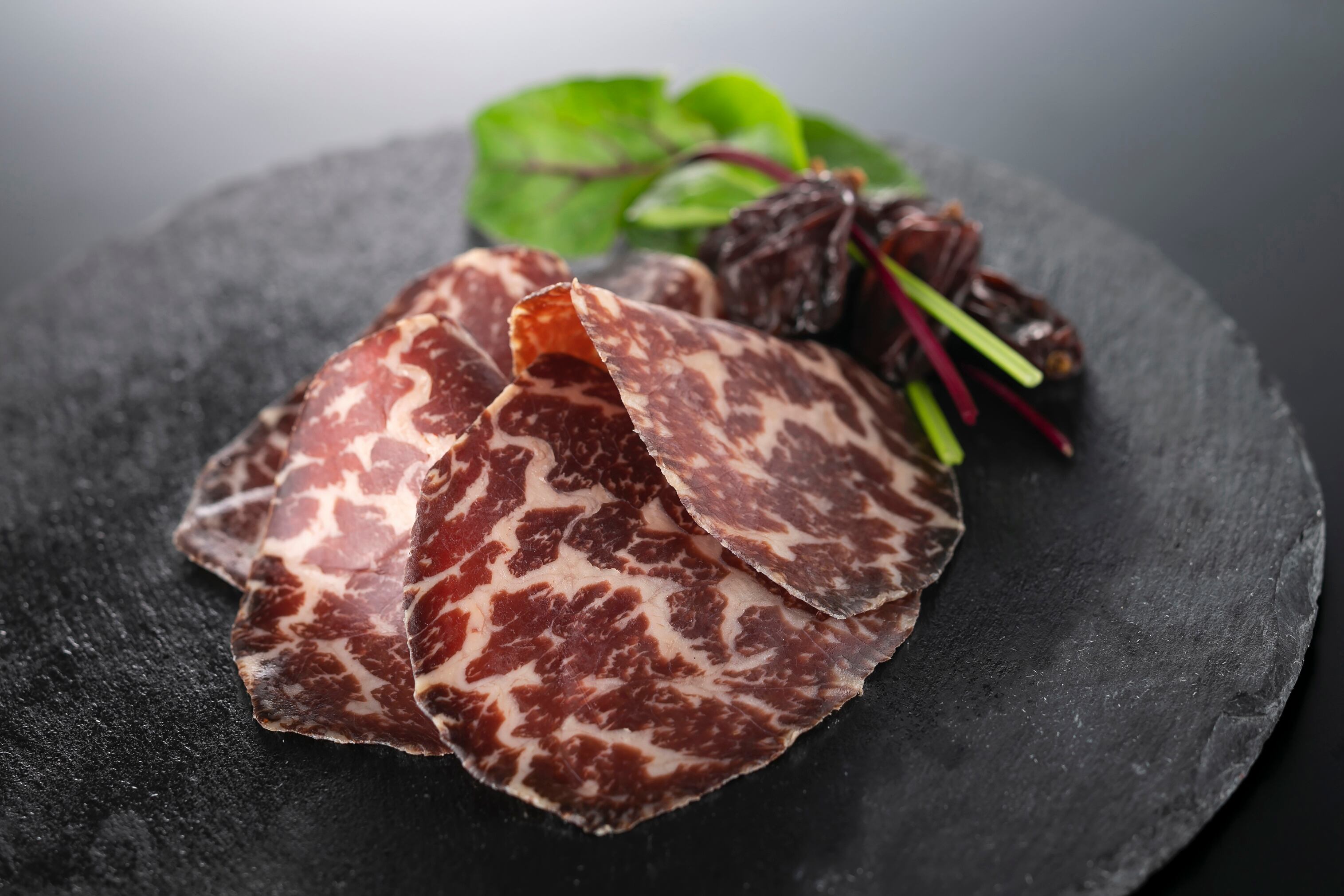 「牛肉の味に加え、チーズのような熟成香がして最後に草の香りがした」「牛が摂取してきたものがそのまま風味として現れている」株式会社肉のふがねの代表取締役の府金伸治氏が知人の紹介でスペインを訪れ、本場のセシーナを試食したときの衝撃はとても大きなものだったと語る。「この生ハムを岩手短角和牛で作りたい!」と直感的に思い、それから研究を重ね、ついに日本初の短角和牛のセシーナが誕生。ぜひご賞味ください。